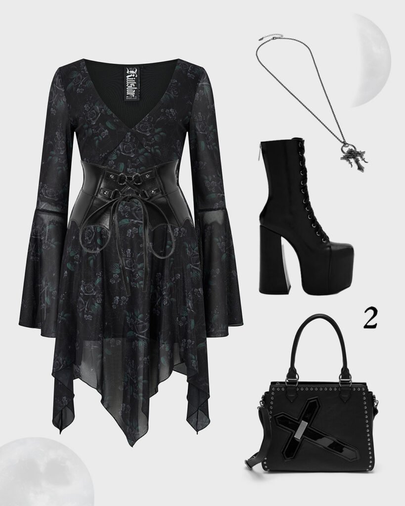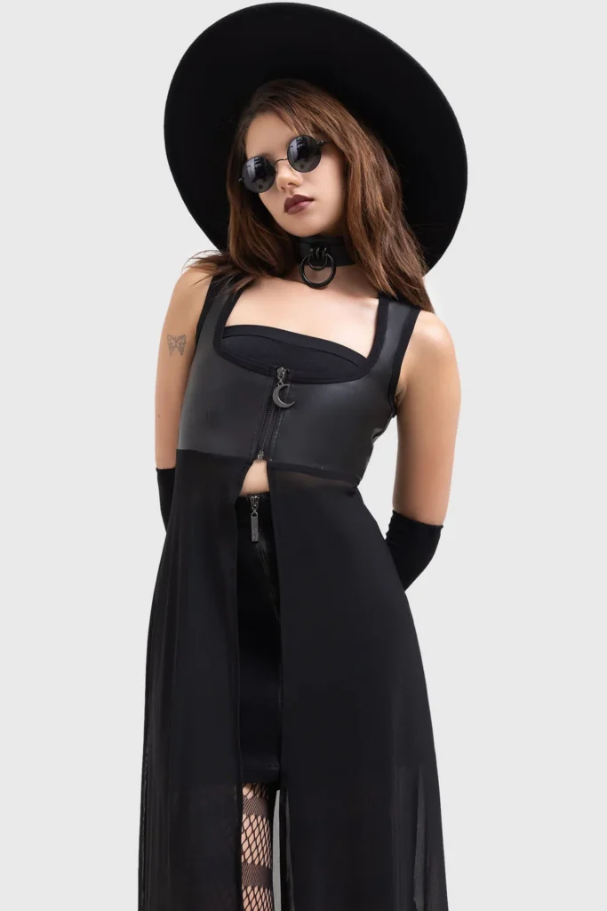 Timeless gothic staples β flowing dresses, mesh tops, corsets, and lace gloves.